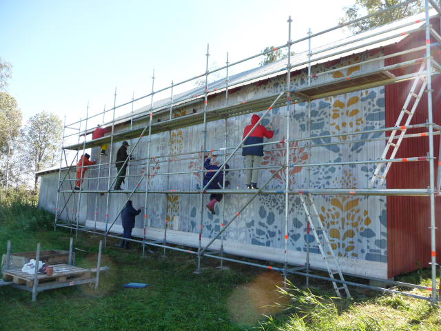 Hur? Under cirka två månaders tid augusti-september 2012 utfördes de praktiska arbetet. Ett tjugotal personer var involverade. Det innefattade: lagning av trasiga delar av vägg, borttagning av gammal slamfärg från väggarna, in oljning av vägg, grundmålning, uppmätning/ uppsättning av rutsystem, överförning av mönster från skiss till vägg, färgläggning i två omgångar samt ett sista lager med de svarta prickarna och uppsättning av belysning.